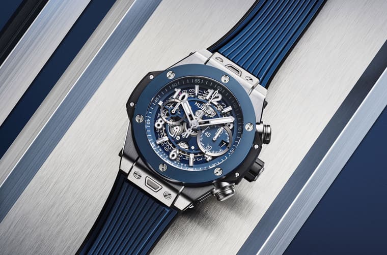 ▲Big Bang Unico鈦金藍陶瓷計時碼錶採用鈦金屬錶殼搭配藍色陶瓷錶圈,加上100米防水性能,充分運動錶的強大機能性。