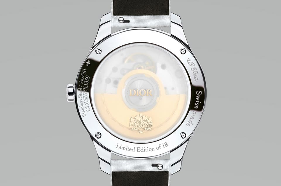 錶背此次亦使用霧面透明底蓋,使得內部搭載的Sellita機芯廠的SW300自動機芯有點若隱若現的神祕感,其中由於自動盤外觀為金色因此會顯得最為吸睛,定睛一看還會發現錶背6點方向印有一枚和手錶正面金龍圖案一致的小巧龍首圖案,搭配6點方向邊緣的”Limited Edition of 18”字樣,雙雙突顯這款龍年紀念錶的特殊身份與收藏價值。