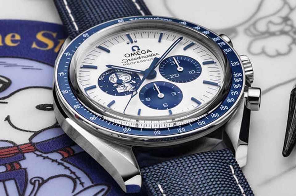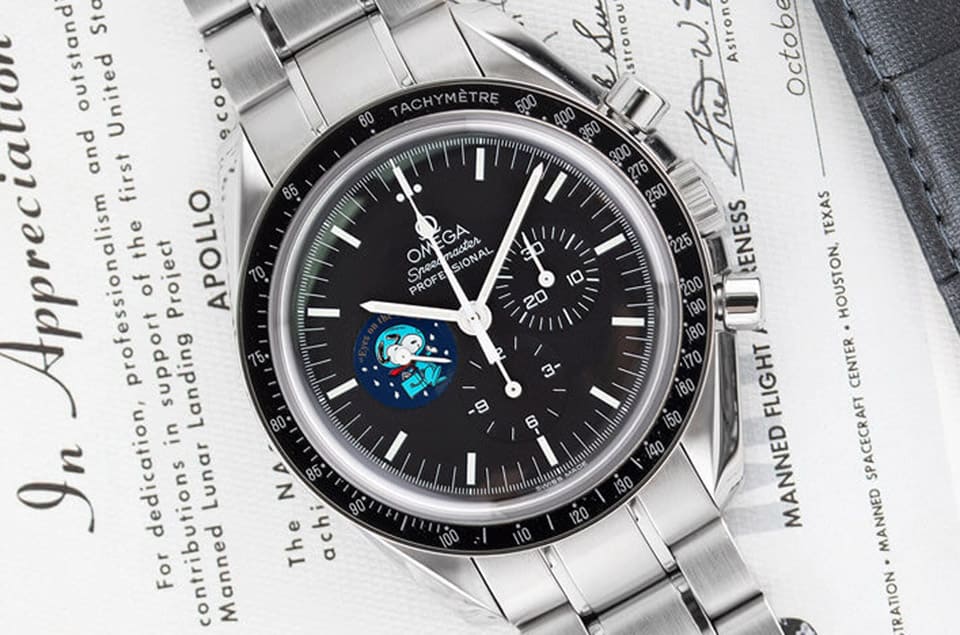 歐米茄最初推出的第1代超霸史努比登月錶已經是2003年的事了,一開始品牌創作的動機是為了要致敬超霸登月錶曾在阿波羅13號任務安全返航的過程中扮演關鍵角色,因而獲得NASA頒贈「銀史努比獎章」的光榮歷史。一開始這款手錶屬於一次性的限量紀念錶,當年品牌限量發行5441只大概和沒限量的意思差不多,錶款與一般登月錶最大的不同即在於面盤上的小秒盤放上了銀史努比獎章的圖案。在那之後史努比登月錶就沒有續作一度淹沒在歷史洪流中,直到2015年適逢阿波羅13號任務屆滿45週年,因此歐米茄才又延續先前的創意,打造出第2代超霸史努比登月錶,也就是從這一代開始,市場對於和銀史努比獎章連結的登月錶興趣大增,或許是因為手錶相對稀有(第2代的限量數進一步縮減至1970只),而且面盤放上史努比圖案多了點童趣味以及獨特感,造成手錶的二級市場行情水漲船高,連帶促成絕版多時的第1代行情也升高。