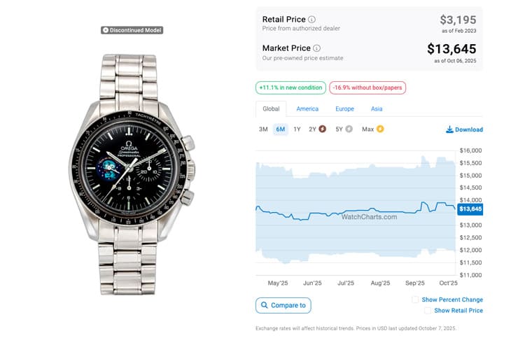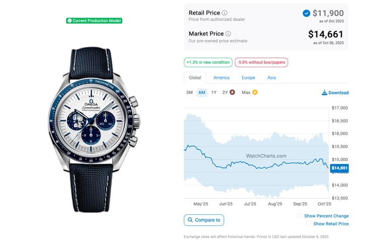 根據高級手錶市場調查研究機構WatchCharts的資料,超霸史努比登月錶於2025年4月的行情已穩步下跌三年,當時1~3代的二級市場報價依序是:13,591美金(約合台幣41萬5)、31,749美金(約合台幣97萬)以及15,380美金(約合台幣47萬),從中可以看出第2代超霸史努比登月錶依舊是此系列中最受收藏家喜愛的一款,而且三款錶一律處於超定價水準,溢價程度也都很可觀。