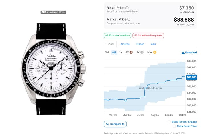 又過了一段時間到了2025年10月,三代超霸史努比登月錶在近半年來各有各的發展,例如第1代自2024年12月以來顯得相對平穩,不過2025年2月經過一波先漲後跌的震盪,然後七個月前有比較明顯的跌幅,直到6月至今才稍微回升;原本行情一路保持平穩的第2代到了2024年底,以及2025年2月分別經歷過兩波小低潮,尤其今年一度快要跌到接近30,000美金那條線,前七個月還算相對平穩地守在31,000美金之上,6月開始回到32,000美金以上,然而到了7月至今又突然狂升超過38,000美金,半年內行情漲了20%以上!而第3代從2024年底以來到2025年2月都還在下滑,在那之後兩個月維持在低檔徘徊,可是到了4月之後行情稍稍回升,站上2025年以來的高點,結果5月後又戲劇化的大跌到半年來最低點,接下來四個月都在低點,最近又有比較明顯的下滑。同樣根據WatchCharts的資料,目前1~3代的最新報價依序是:13,645美金(約合台幣41萬7)、38,888美金(約合台幣118萬8),以及14,661美金(約合台幣44萬8),三代超霸史努比登月錶的身價僅第3代比起半年前有所貶值,其他兩代反而身價更高了。