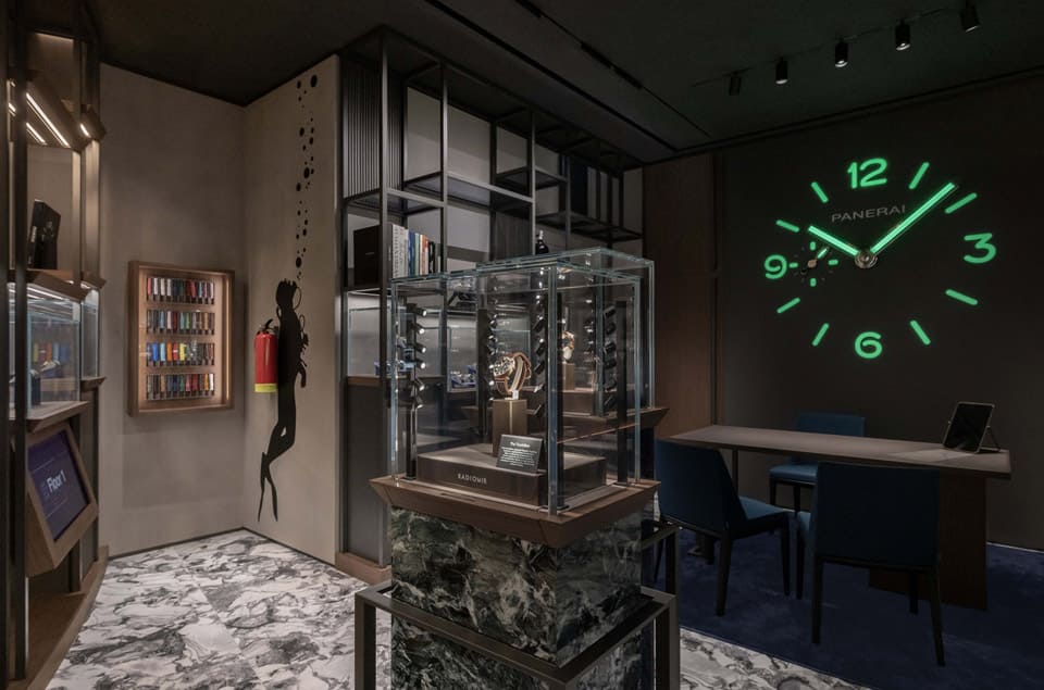 走進沛納海全新台北101概念旗艦店,首先會注意到鑲有沛納海名稱、發跡地點及創立年份等金色字樣的大理石地板,接著會看到品牌經典DNA的大型夜光面盤壁鐘,發出綠色光芒的指針與時標一如品牌手錶常用的Super-Luminova®夜光塗層,不需特別走進就能看清楚時間推移的軌跡。
