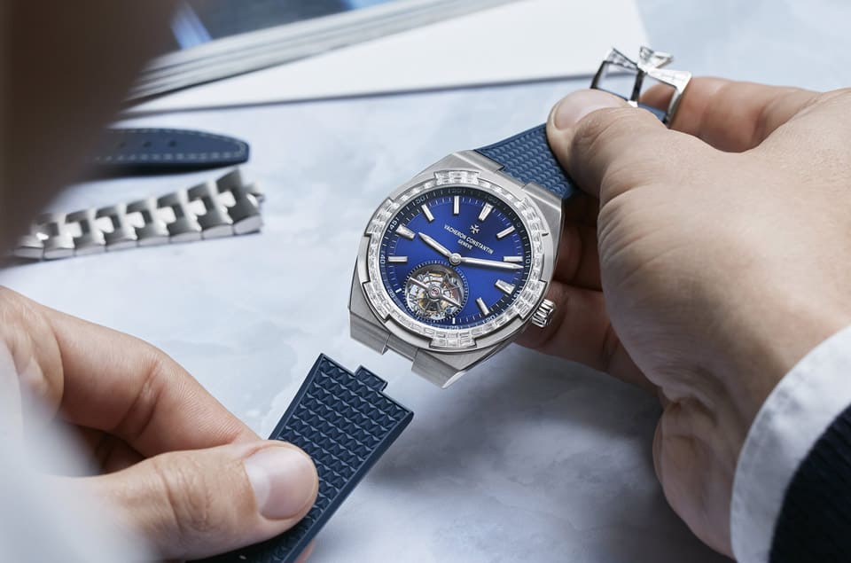 身為Overseas系列中功能與材質都更為講究的高端款式,Overseas高級珠寶陀飛輪除了配備白金鍊帶之外,江詩丹頓也會同步提供藍色橡膠錶帶以及藍色小牛皮錶帶,由於此系列都具備錶帶快拆系統,因此隨附的錶帶不會讓人感到困擾,反而可以隨時隨地輕鬆更換錶帶,營造出不一樣的視覺與穿搭感受;附帶一提,包括錶帶的白金針扣也會鑲上16顆長階梯形切割鑽石,呼應手錶正面的高貴氣韻。