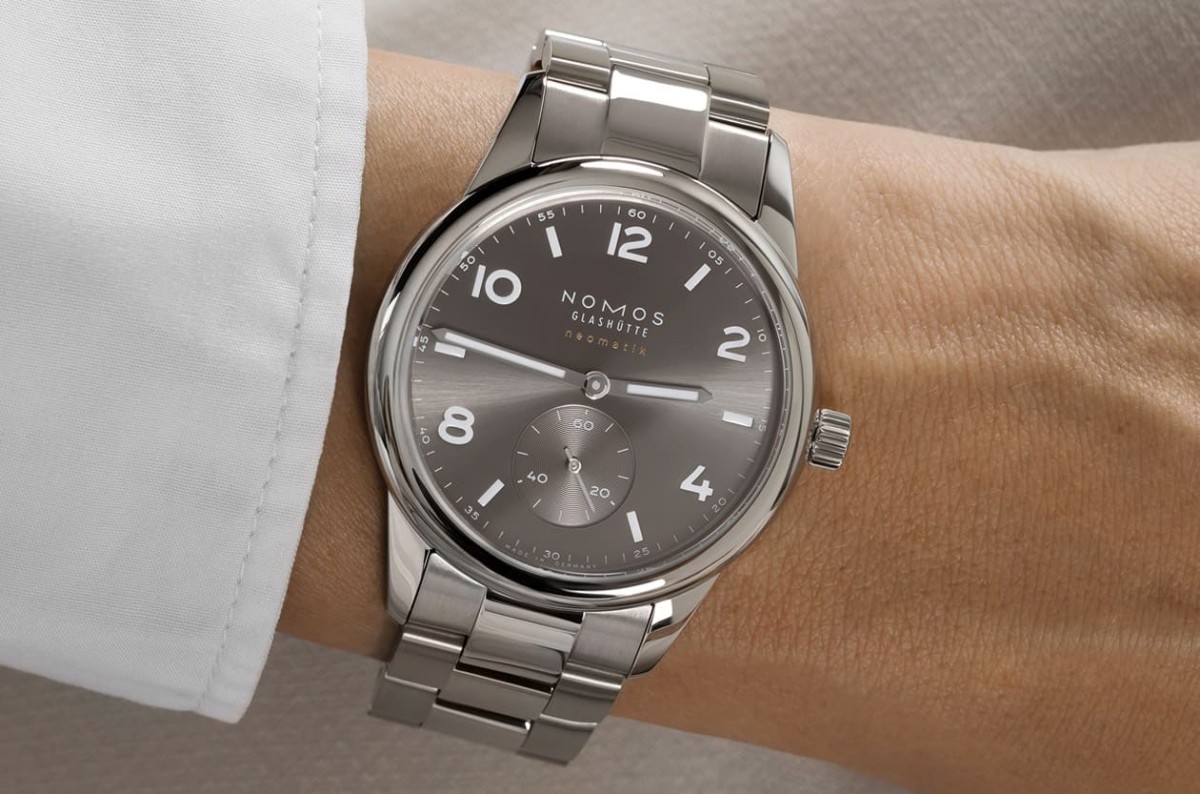最新一款Club Sport的錶徑為這款作品先前未曾見過的39.5mm,厚度也是介於前兩種尺寸之間的8.4mm,維持相對纖薄的舒適佩戴體驗,不過NOMOS還是維持著腕錶外型特徵,適度調整比例讓它看起來還是很陽光動感。尺寸修改後,39.5mm的Club Sport比照37mm款式的防水性能維持在200米,無論配置的是實底蓋或是透明底蓋,手錶的防水能力都一樣優異,尤其透明底蓋款式可以讓人一睹腕錶內在的紮實規格機芯,更具賞玩機械錶的吸引力。此外Club Sport搭配的金屬鍊帶也是強化其運動個性的關鍵要素之一,NOMOS採用三排式錬節設計,兩側錬節表面經過緞面處理、中央錬節則採拋光修飾,如此一來腕錶的光澤更具層次,較大範圍使用緞面打磨也有助於隱藏日常佩戴難以完全避免的細小刮痕,而且品牌設置折疊扣來開闔鍊帶,既安全又穩固,讓人能戴得自在又放心。