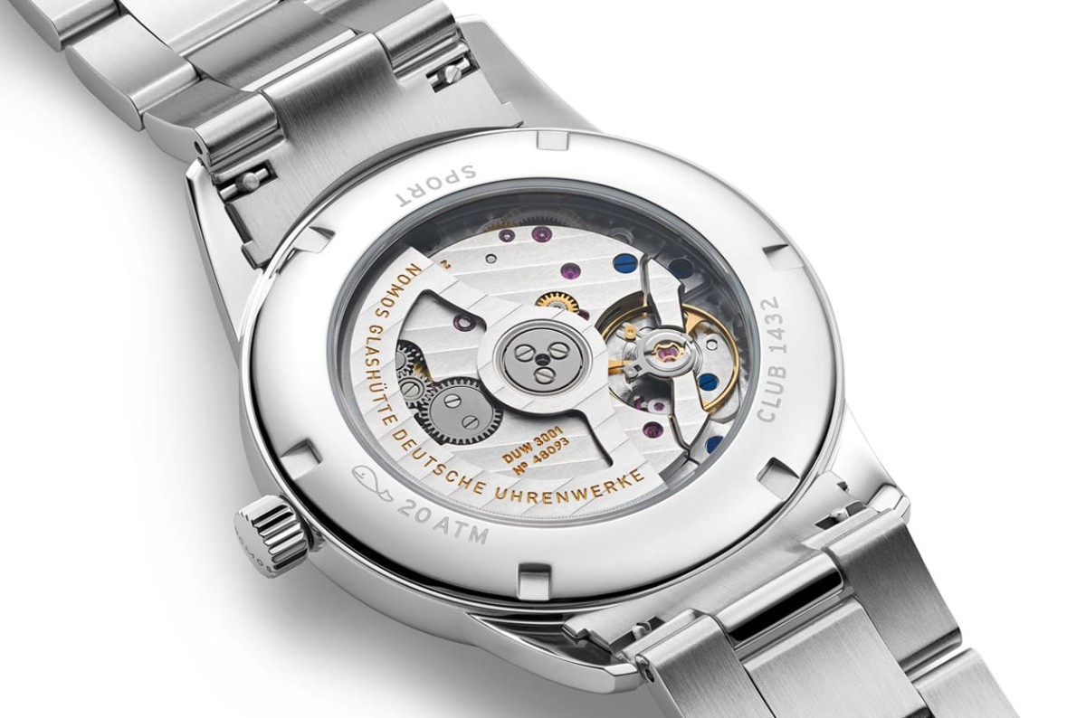Club Sport neomatik 39的透明底蓋下可見NOMOS自製的DUW 3001自動機芯,這枚具備小三針顯示的機芯厚度僅3.2mm,是腕錶能維持纖薄設計的重要因素,它採用鏤空大自動盤設計可以維持優異的上鍊效率,包括自動盤與機芯底板都有格拉蘇蒂條紋裝飾,中層夾板也有魚鱗紋,具體演繹高級製錶追求進階工藝水準的精神。這枚機芯重新改造過內部的大鋼輪零件,使其比一般設計更為纖薄,結合品牌重新設計規劃後的機芯結構,能有效將動能傳輸過程中的摩擦損耗率壓低至5.8%左右,比起一般機芯的動能摩擦損耗率約20%優化不少。而且NOMOS也在這款機芯中導入具有品牌專利設計的擒縱系統,內含DUW調速裝置能將游絲長度調節得更密致,使得腕錶走時準度保持在高檔。最後不可不提的是,DUW 3001機芯在出廠前往往會先經過六方位調校檢測,要求比天文台認證更為嚴格,確保腕錶的走時品質不因擺放位置而出現明顯落差,協助佩戴者有效掌握日常的時間分配。