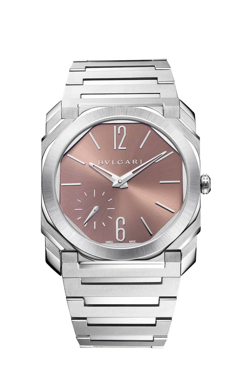 自從2017年首度問世以來,Octo Finissimo Automatic已經陸續延伸出不同材質、配色,甚至還有搭載鏤空機芯的版本,然而2024年寶格麗新推出的兩款新作中,有一只乃是首度嘗試採用黃金材質,和近年悄悄回溫的金錶熱潮互相輝映,至於另一只則是Octo Finissimo Automatic不陌生的不鏽鋼材質,可是品牌此次在面盤顏色上大作文章,以特別的配色重新演繹不鏽鋼錶殼Octo Finissimo超薄自動錶的招牌複雜線條。