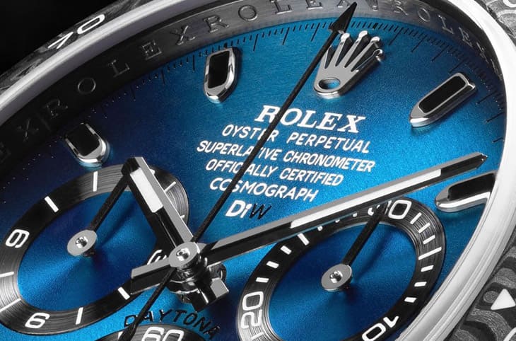 Daytona Azure UP的錶殼與錶圈都呈現出碳纖維材質獨一無二的不規則紋路,DiW在錶圈的測速計刻度上填入白色,使其因為強烈對比而看得一清二楚,而手錶面盤與錶帶兩側縫線同樣都是藍色,並且經過太陽放射紋修飾,能反射出多變的色澤層次。