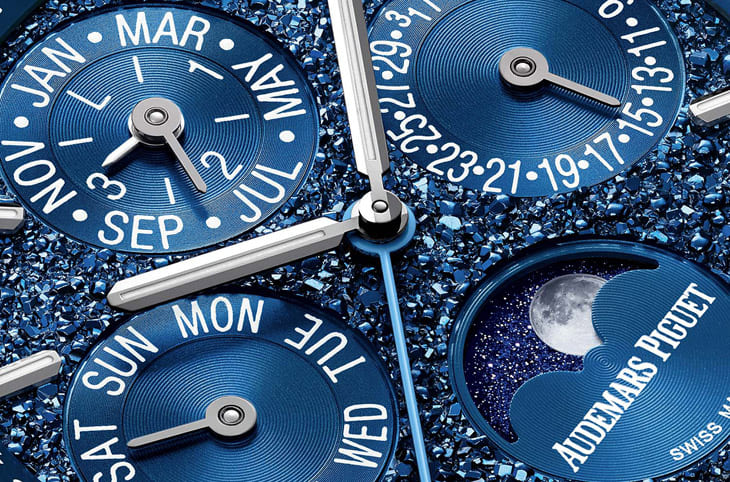 愛彼AP在了解了John Mayer的想法後,也積極幫助他「圓夢」,品牌很有誠意地既非考古如法炮製Tuscan面盤,也不是沿用16202BC的面盤裝飾,反而重新研究了Tuscan面盤之後,嶄新開發出名為「晶沙」(Crystal Sand)的面盤工藝,面盤的基礎一樣是常見的黃銅材質,品牌採用沖壓技術獲得貌似水晶般的不規則晶體形狀,品牌表示沖壓模具是透過一種電鑄的金屬沉積過程將藍色覆於不規則狀的黃銅表面,要在不規則狀的表面均勻上色,可想而知製作過程絕對不容易,最終形成的效果比起Tuscan面盤、16202BC的粒紋面盤都要更立體,搭配皇家橡樹萬年曆的功能與設計,讓晶沙面盤很容易讓人想到浩瀚無垠的星空。
