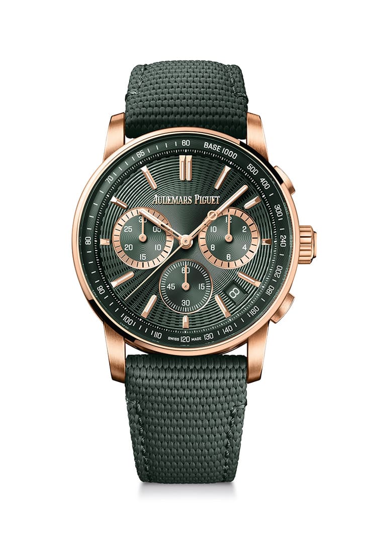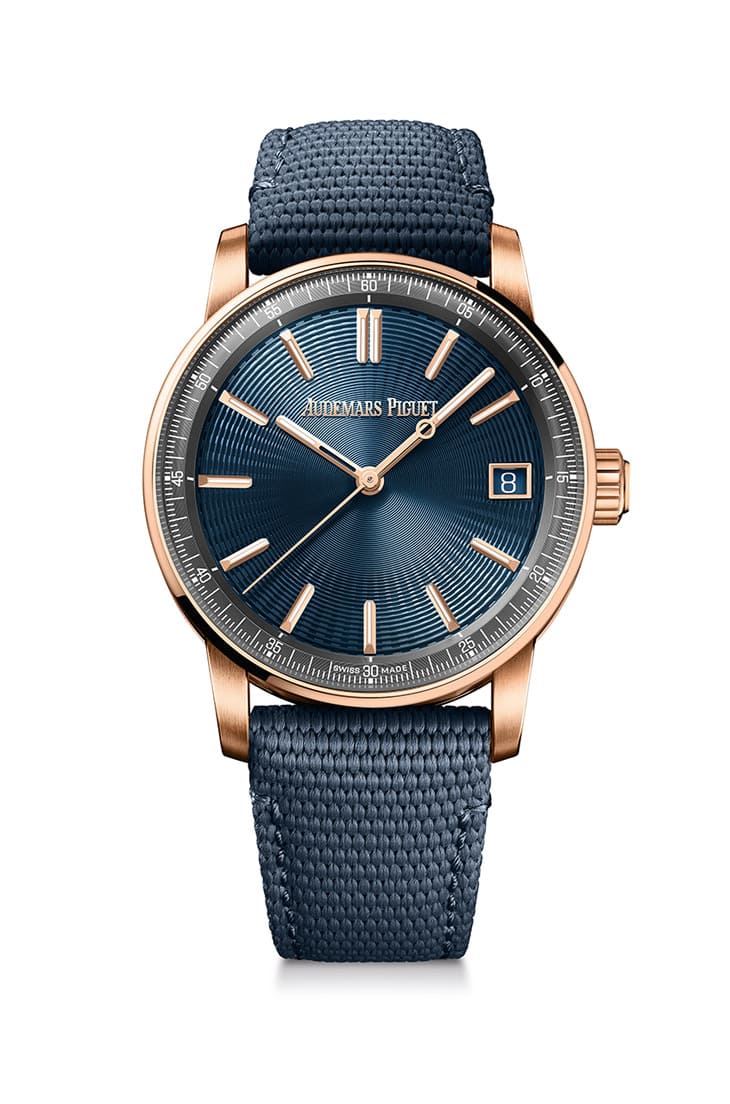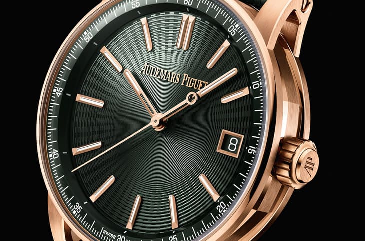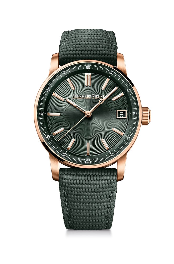 至於41mm的CODE 11.59自動錶則是首度出現玫瑰金錶殼搭配漣漪飾紋面盤的新組合,這種面盤正是由2023年的不鏽鋼CODE 11.59自動錶41mm所率先應用,愛彼AP是和瑞士機刻雕花師Yann von Kaenel攜手設計,先用手工雕琢出沖壓用的模具,使其能將面盤壓印出層次起伏的同心圓圖案,其能折射富有變化性的光線,形成猶如水面上的粼粼波光,因而被稱為漣漪飾紋。品牌用以詮釋玫瑰金加漣漪飾紋面盤的配色分別有兩種,一種和38mm款式一樣是「雲夜藍50」色,另一種則是系列近年陸續使用過的綠色,而愛彼AP也延續著去年不鏽鋼CODE 11.59自動錶41mm改款後的設計,例如錶冠刻紋變得更密致、時標改為幾何造型、時標與指針添上夜光塗層,再將日期顯示移到3點方向還加上與錶殼同色的邊框等,CODE 11.59自動錶41mm一律配置編織紋理橡膠錶帶,與38mm款式的皮帶做出區隔。