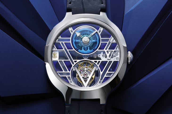 ▲路易威登的Voyager陀飛輪以鉑金和白金製作招牌錶殼造型,面盤融入源遠流長的彩繪玻璃琺瑯工藝更是前所未見的新亮點。