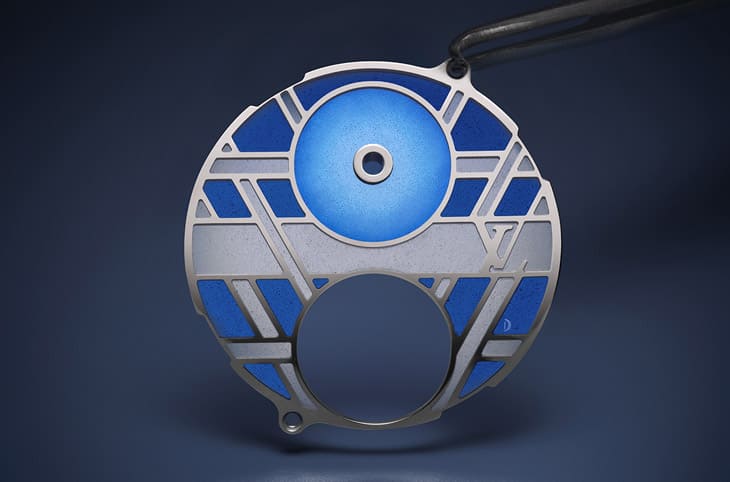 以往的Voyager Flying Tourbillon “Poinçon de Genève”往往採用大範圍鏤空,讓佩戴者可以集中視線在面盤上下半部的偏心錶盤以及飛行陀飛輪裝置,但是2024年路易威登對於手錶的外觀造型有了新想法,品牌受到現存各種彩繪玻璃琺瑯工藝所啟發,認為這種既具有視覺穿透力與色彩美感的工藝很適合應用在製錶領域中,於是路易威登在仔細研究過這種工藝後,選定以歷史最悠久、製作難度也特別高的"Percé"技術替手錶營造全新視感。