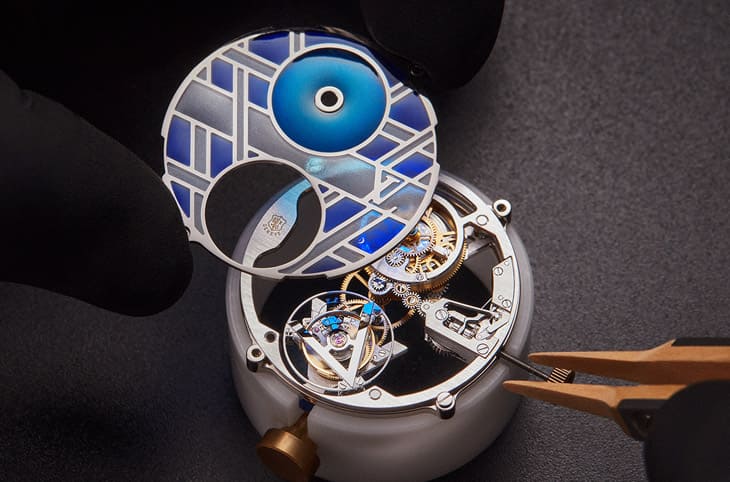 為了讓琺瑯釉料可以呈現在面盤上,手錶正反面都加上了多道水平以及V字型橋板,在創作彩繪玻璃琺瑯面盤的時候,琺瑯師是以最傳統的毛細管填充作用,將釉料附著在橋板之間的鏤空結構,填上釉料時講究快、狠、準,稍有猶豫就可能導致成品不符標準。路易威登旗下的琺瑯師花費好幾個月精心研究這種傳統工藝,最終讓他們找到剔透度和光澤度都適用於Voyager Flying Tourbillon “Poinçon de Genève” Plique-à-jour的漸層藍色,其中12點方向偏心小錶盤共使用群青、天藍與藍灰,形塑出手錶成品所具備的蛋白光澤半透明飽和藍色。而除了要製作出彩繪玻璃琺瑯錶盤不容易,包括安裝小錶盤上的指針時也非常考驗製錶師的手眼協調性與專注力,小錶盤上的環圈要對齊得恰到好處,指針才能精準無誤的指示時間。