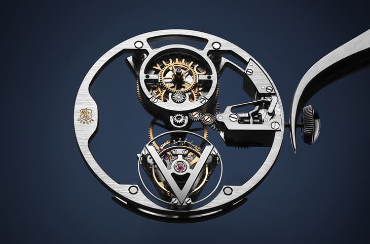 至於其他鏤空橋板之外的空間也都填上藍色系的彩繪玻璃琺瑯,簡單來說,一款Voyager Flying Tourbillon “Poinçon de Genève” Plique-à-jour的面盤會需要反覆塗上5~6層的半透明釉料,每塗一層就要進窯爐燒製一次,如此反覆循環後,面盤的清透感才會出現,通常這代表大約一百個工時已經過去。