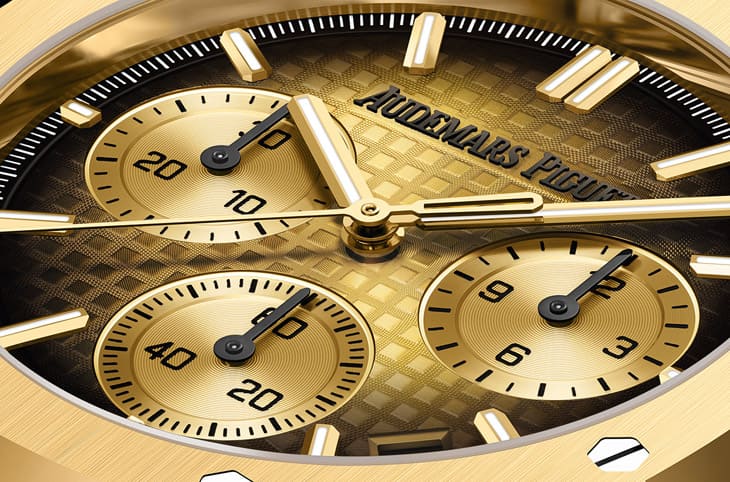 前面提到新款皇家橡樹41毫米自動計時碼錶和先前皇家橡樹50週年紀念款16202BA存在一些淵源,後者的面盤特色是在Grande Tapisserie大型格紋面盤增添漸變煙燻效果,因此手錶的黃金色面盤會呈現由中央往邊緣逐漸變黑的漸層感。愛彼AP在製作面盤過程中乃是先在黃銅底板以機刻工具刻製出縱橫交錯的立體格紋,接著再用電鍍技術將黃銅表面鍍上一層18K金;後續的工序相當關鍵,品牌工藝師會用類似噴漆筆的工具將黑色亮光漆由外而內噴在面盤上,所以最終面盤才會形成裡面是金黃色、愈往外圍顏色愈深的漸層煙燻感。