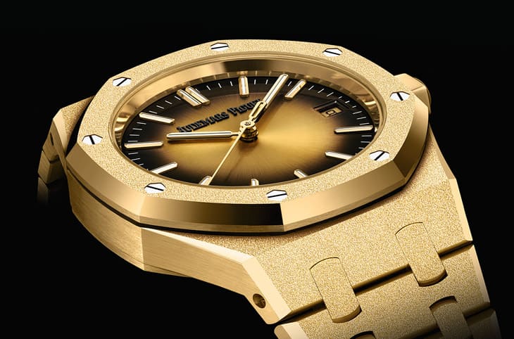 愛彼近年引進用於裝飾手錶外觀的霜金工藝(Frosted Gold)源自佛羅倫斯的一種古老工藝,品牌先前與義大利珠寶設計師Carolina Bucci合作,將原本用於點綴珠寶的古法轉移進入製錶領域,簡單來說霜金工藝在製作過程中需以鑽石頭的錘具錘擊K金零件,在其表面形成眾多微小凹陷痕跡,最終就能呈現不規則紋路,遠看彷彿手錶鑲滿了鑽石般光芒四射。