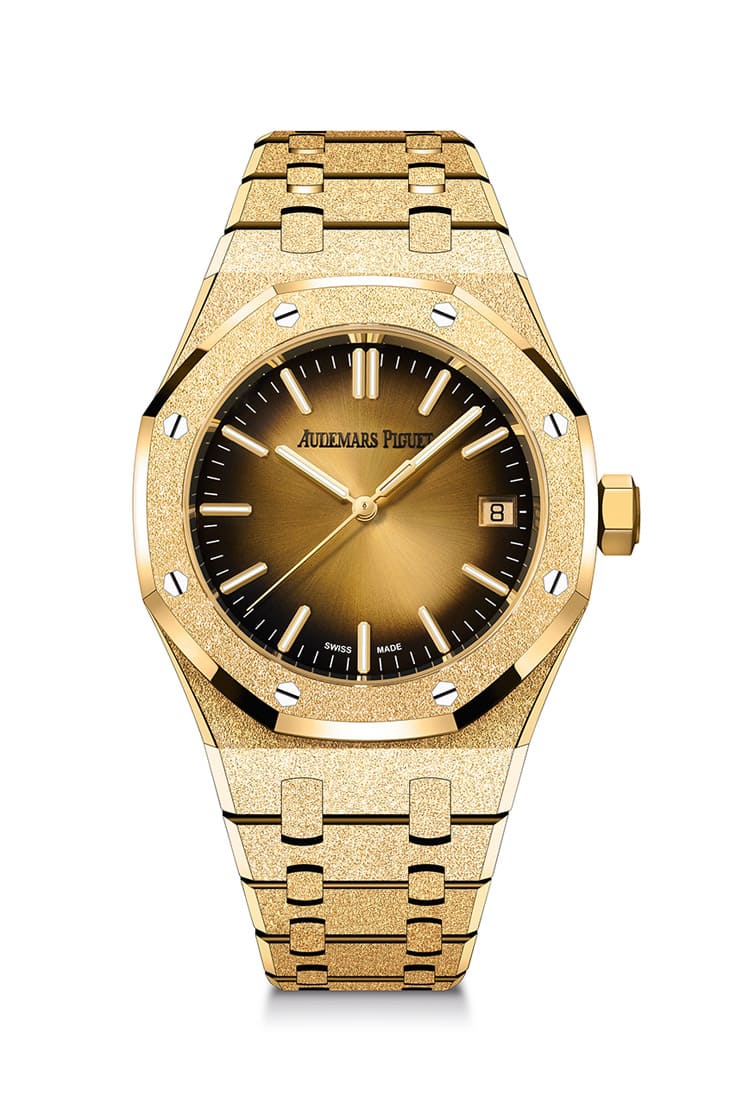 新登場的皇家橡樹霜金自動錶以黃金材質製作,在前幾年錶壇又開始熱衷於金錶風潮之下,如今皇家橡樹系列的中性尺寸基本款又多了一款黃金材質的選項。