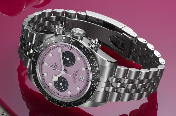 手錶採用與多數Black Bay計時碼錶一致的不鏽鋼材質,錶徑也不變依舊是41mm,同時如前所述為了突顯粉紅款的特別,因此帝舵改替手錶配置不鏽鋼五珠帶,結合品牌特有的T-fit快調錶扣,利用快調系統的五個孔位可以徒手微調鍊帶長度(至多達8mm),讓手錶戴得更剛好舒適。