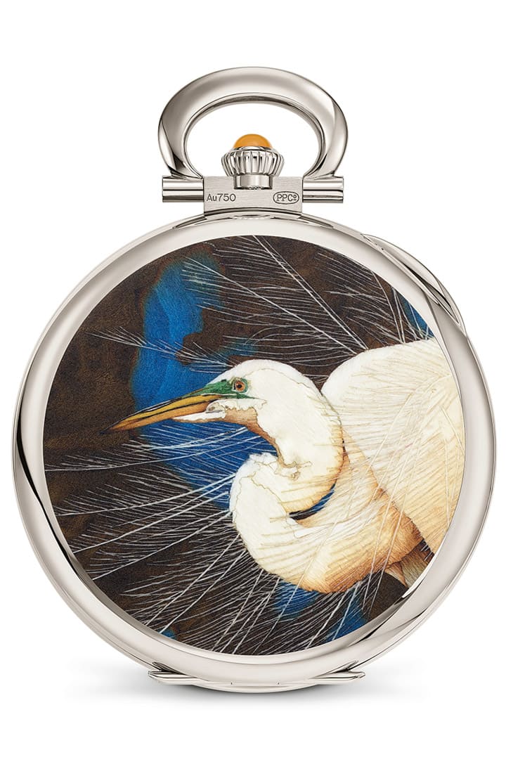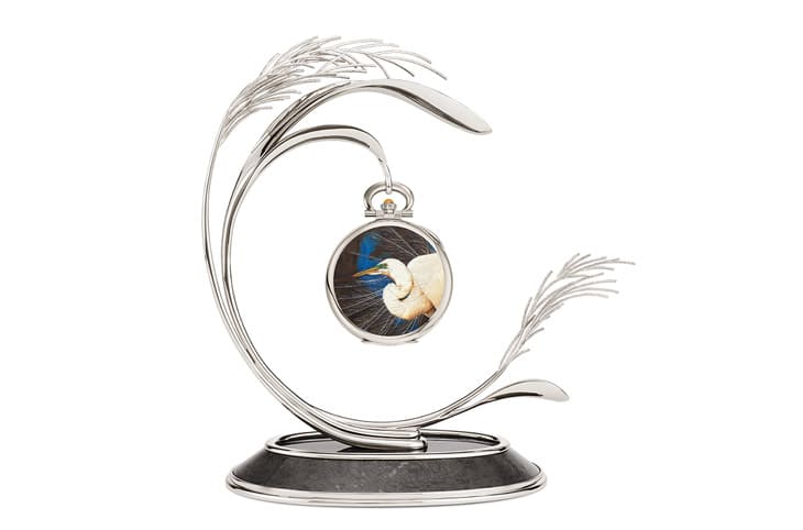 有趣的是,錶冠上鄉有一顆約重0.29克拉的橘色蛋白石,相同的顏色和錶背白鷺圖案的鳥嘴呼應,而且PP連懷錶的安置問題都想好了,他們替懷錶設計了一個白金底座,底部為飾有黑曜石的圓形基座,至於基座延伸成的掛鉤則是雕刻成蘆葦造型,猶如白鷺出現在河岸邊的蘆葦叢中探出頭來,整體呈現的畫面完整度令人驚豔。