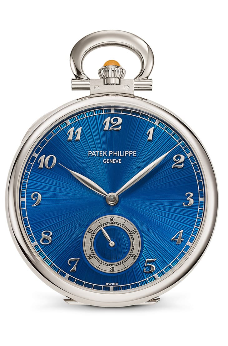 懷錶錶背描述的是一隻白鷺的側面肖像。與5089G-129「海灘的早晨」類似,百達翡麗同樣採用細木鑲嵌工藝表達主題,面盤分別以53枚片狀木質零件以及多達400枚迷你的鑲嵌物件組成,箇中含有18種不同顏色、紋理的木材,在黑色與藍色背景下,讓米白色的白鷺可以躍然於面盤上,細看白鷺的嘴巴、眼睛等都刻畫入微,對於色彩與微小零件的精準掌握突顯百達翡麗工藝的爐火純青程度。至於翻到面盤部分,百達翡麗先在金質面盤鐫刻放射紋,接著圖上藍色半透明琺瑯,使得面般細緻的紋路略帶點羽毛的既視感。此外面盤邊緣鑲上金質立體寶璣數字時標,搭配白金柳葉型指針,而6點方向也還設有小秒盤,由此顯示時間的基本單位。