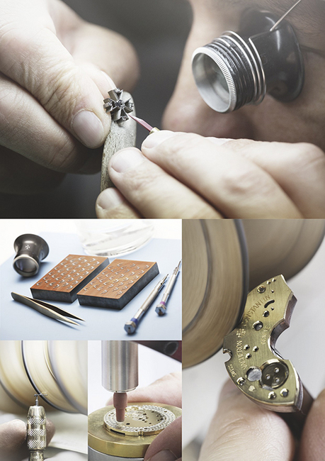 江詩丹頓機械機芯中每個零件的表面都採用手工精心裝飾,即使是隱藏在機芯內部的零件也不例外,例如橋架或夾板的裝飾表面組裝後就會貼合在一起。堅持這一超凡加工水準的鐘錶製造商如今已是鳳毛麟角。舉例來說,經驗豐富的倒角工藝師需要耗費整整一個多月的時間來處理鏤空陀飛輪機芯上的零件,因為光是處理陀飛輪框架橫橋就需要12個小時左右,而每個陀飛輪都有兩個框架橫橋。同樣地,由1,500多個珠狀或圓點組成的圓形粒紋圖案或點刻圖案必須錯落有致地裝飾在小巧的自動上鍊機芯主夾板表面。不管是使用車床或銼刀進行的倒角處理,還是直線打磨、啞光效果處理、矯直、圓形粒紋打磨或日內瓦條紋圖案裝飾,每一項工藝都需由技法精湛、熟練靈巧的工藝大師來完成。