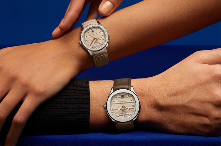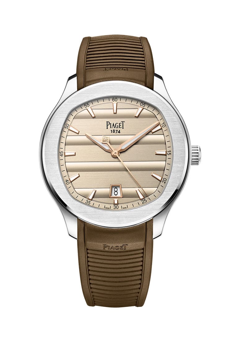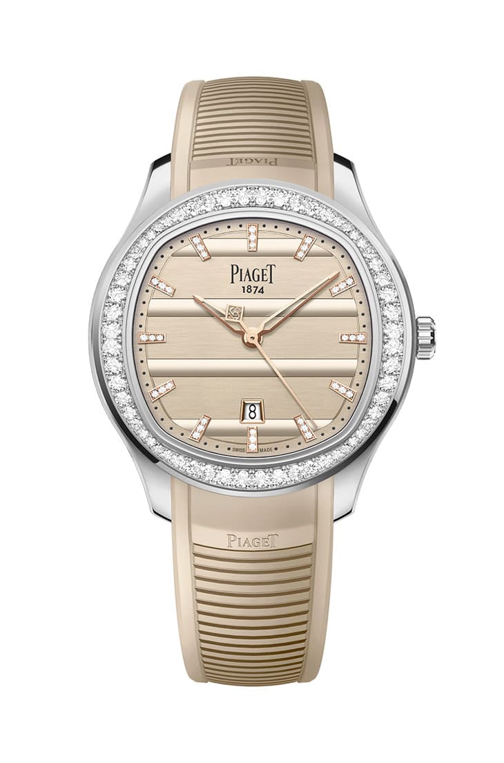 Piaget Polo 150週年紀念錶以不鏽鋼材質製成,伯爵分別推出42mm與36mm兩種款式,前者配置棕色橡膠錶帶,後者則是配置卡其色(或奶茶色)橡膠錶帶,之前36mm的Piaget Polo要嘛是搭鍊帶要嘛搭皮帶,因此150週年紀念錶換上橡膠錶帶對於這種尺寸的Piaget Polo來說還滿新奇的;此外36mm款式的錶圈額外鑲有60顆明亮形切割美鑽,因此手錶的視覺感受更為華麗,也更富有吸引女性的魅力。