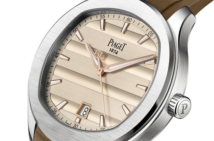 兩款Piaget Polo新作外觀都還是延續伯爵「形中有形」的設計基礎,在圓形錶殼中帶有枕形面盤的線條,因此手錶的錶圈樣式也顯得相對奇特,品牌並於醒目的錶圈表面加上拉絲處理,與錶圈的倒角拋光以及錶耳的拋光形成不同光澤層次。