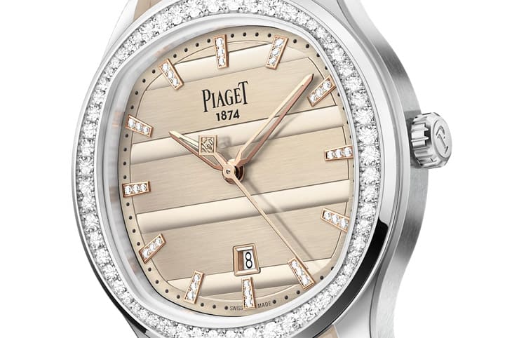 至於新款最大的亮點出現在面盤的裝飾,原本Piaget Polo面盤飾有纖細且密集的立體水平飾紋——從Polo系列中一脈相承再加以改良的特色,伯爵為了慶祝150週年,因此把類似Polo 79那種作工更複雜的平面/立體水平飾紋引進Piaget Polo 150週年紀念錶中,這種飾紋以緞面加上弧形拋光交錯組成,塑造出獨具特色的印象,品牌也特地配上玫瑰金時標與指針強化手錶的紀念價值;值得一提的是,手錶的秒針末梢平衡器從原本的"P"字造型改成了數字"150",從細節中突顯週年里程碑的意義,而雖然42mm和36mm款式的指針造型都與現役的Piaget Polo相同,不過前者有加上夜光塗層、後者則是呈現鏤空處理,而36mm的時標還精心鑲上了鑽石,與錶圈美鑽內外呼應。