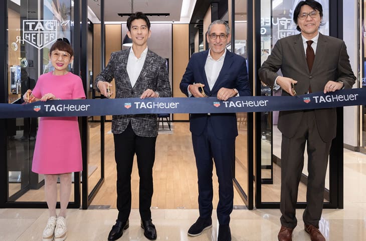 ▲左起為遠東百貨總經理徐雪芳、嘉賓修杰楷、TAG HEUER大中華區總裁Yassin Tag、TAG HEUER台灣品牌總監鄭安生共同為板橋大遠百專賣店開幕剪綵。