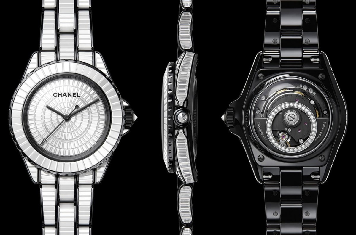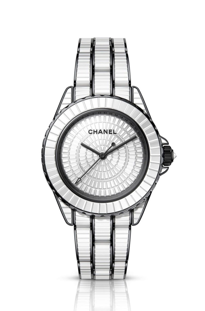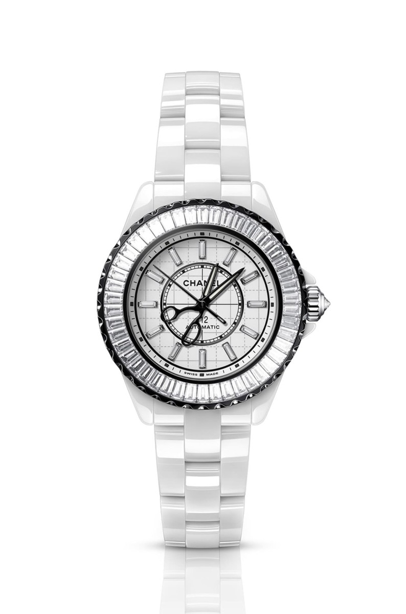J12系列中同樣是高級製錶款式尚有J12 Couture 33毫米腕錶的鑲鑽版,以白色抗磨陶瓷錶殼,內部搭載品牌自製的小型Caliber 12.2機芯,錶圈鑲嵌46顆長階梯形切割鑽石,資深工匠同樣採用錘擊鑲嵌技術,費時一天全心全意投入其中方能完成所有鑲嵌工事,品牌還額外將精鋼錶圈以DLC鍍層覆上均勻黑色,由此烘托鑽石的晶亮光采。此外腕錶面盤另鑲有12顆長階梯形切割鑽石替代時標,加上錶冠亦鑲有明亮式切割鑽石,凡此都替腕錶打造出與白色抗磨陶瓷彼此輝映的華麗高雅個性。腕錶機芯同樣經過NAC電鍍上黑色,於錶背幾乎都是白色系的錶殼與鍊帶零件組合中顯得格外吸睛。