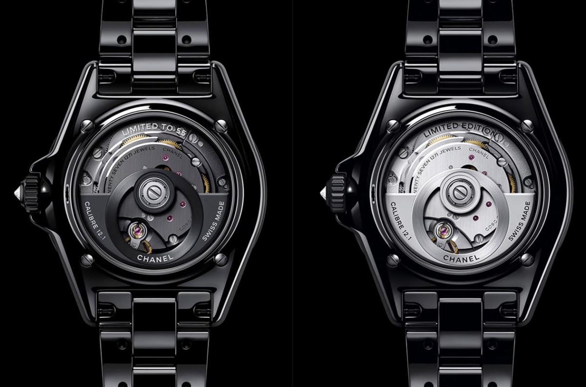 腕錶搭載的Caliber 12.1機芯同樣經過NAC電鍍覆上黑色,彰顯其高級製錶的身份,而且這枚機芯還有香奈兒特別安排的驚喜,其自成一格的同心圓輪系中額外在鏤空自動盤上鑲飾了34顆明亮式切割鑽石,與腕錶側面的鑽石相互輝映,使錶主在脫下腕錶後不僅可以愜意欣賞錶背瞬間由白色轉變為黑色的高反差設計,也能吸引人靠近感受機芯組件的結構以及細緻作工。