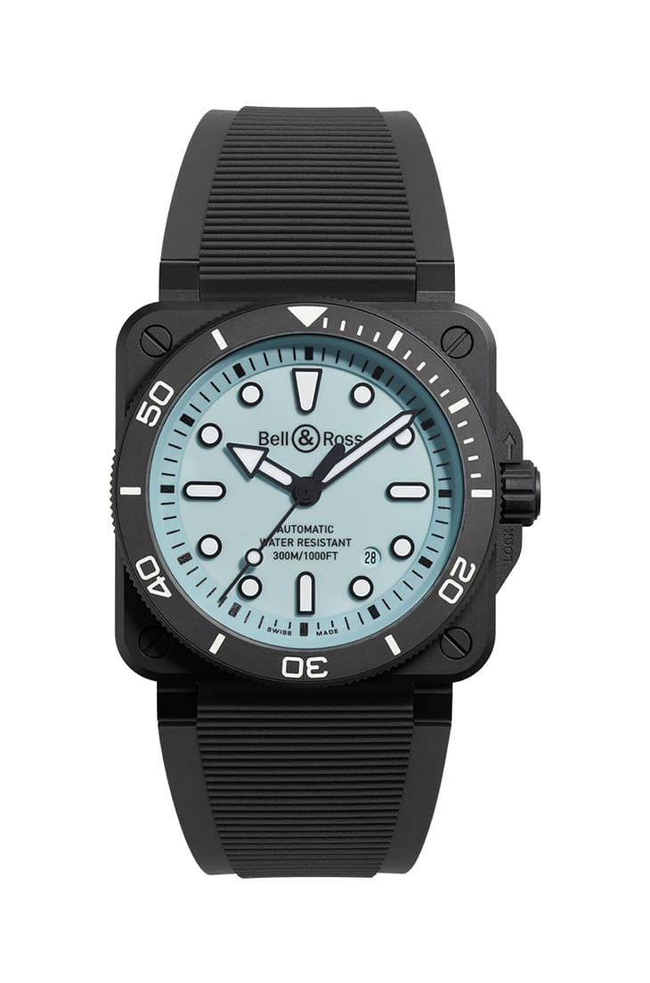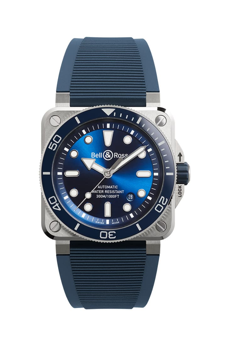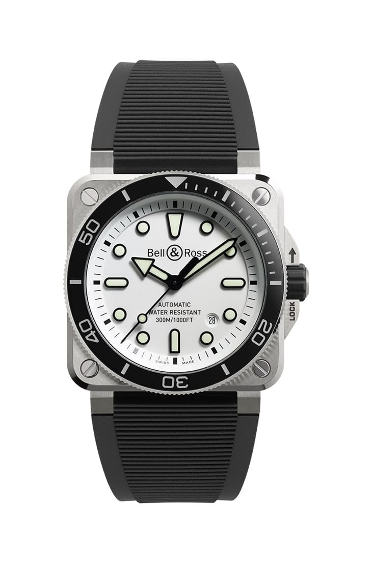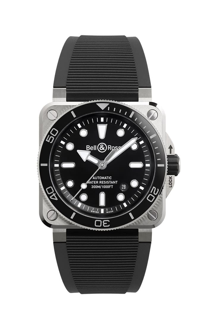 旗下手錶展現強悍機能運動風的BELL & ROSS,他們家的潛水錶和其他品牌相較有個特色在於錶殼造型,通常潛水錶多數都是圓形錶殼,不過BELL & ROSS的BR 03 Diver卻是少見的方形錶殼潛水錶,光是這點就讓他們家的潛水錶比他牌更具吸引力。