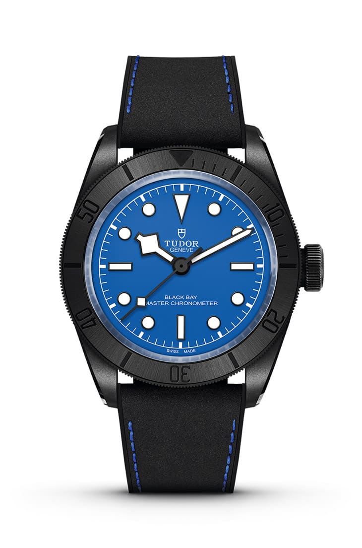 錶款就和先推出的Black Bay Ceramic一樣採用黑色陶瓷材質,它以一體成型的霧黑色陶瓷勾勒外觀,零件邊緣的倒角拋光和錶圈、錶殼經過噴砂處理的粗獷感呈現強烈對比,讓全黑的手錶還是能突顯本身的流線造型。與錶殼黑色唱和的還有黑色皮膠合成錶帶,它的內襯飾有和時針對應的雪花圖案,表面兩側特別用藍色縫線與面盤顏色相配,再來它的摺疊扣也經過PVD鍍層覆上黑色,據知品牌還會隨錶附上一條黑色織紋錶帶,錶帶中央有一道藍色條紋,整體配起來十分合拍。