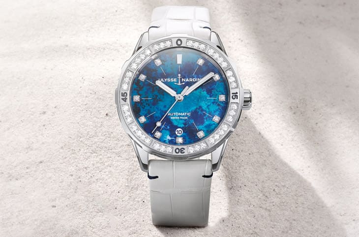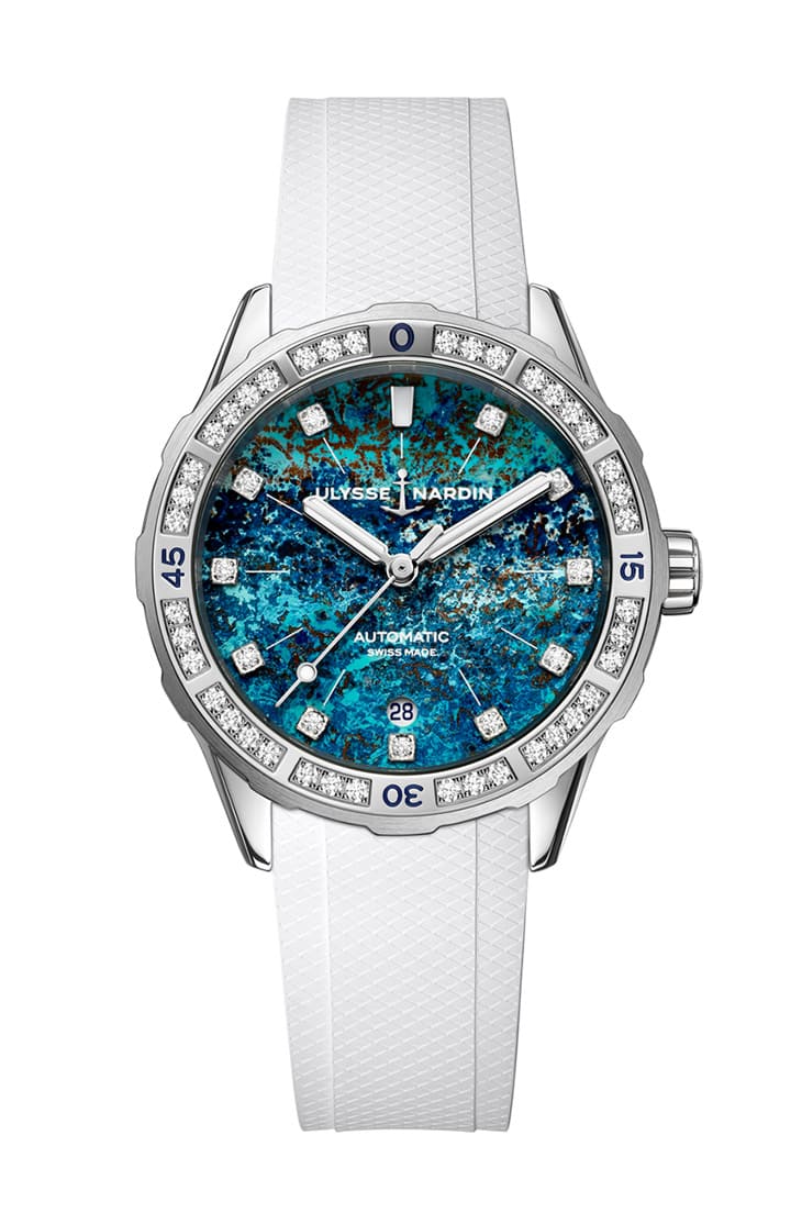 ULYSSE NARDIN雅典錶潛水系列Diver過去曾推出面盤以珍珠母貝或砂金石點綴的高顏值路線作品,2024年品牌再接再厲發表新作Diver Atoll珊瑚礁潛水錶,手錶以少見材質製作面盤,搭配點綴在局部零件上的鑽石,賦予高機能性的潛水錶賞心悅目的視覺享受。