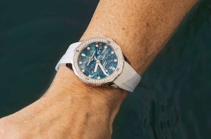 ▲Diver Atoll珊瑚礁潛水錶以再生鋼材製作錶殼,並於錶圈鑲上40顆鑽石,奠定美型基礎。