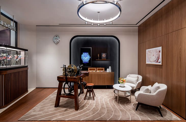 寶璣台北101專賣店內部裝潢還有許多富有巧思的細節,例如牆壁的裝飾仿效寶璣手錶上的著名錢幣紋、地毯圖案竟能讓人想到寶璣手錶面盤與機芯不令人陌生的機刻雕花圖案,抬頭看天花板還會注意到燈具造型似乎有一種機芯組件的既視感,一切的一切都能與寶璣悠久精湛的工藝血統呼應。而如果有機會進入寶璣台北101專賣店的VIP室,迎面而來的是擺滿品牌書籍與寶璣先生雕像的壁櫃,瞬間有一種置身圖書館的文藝氣息,這讓人在品鑑寶璣的手錶作品時,可以更安心融入於現場的環境中。
