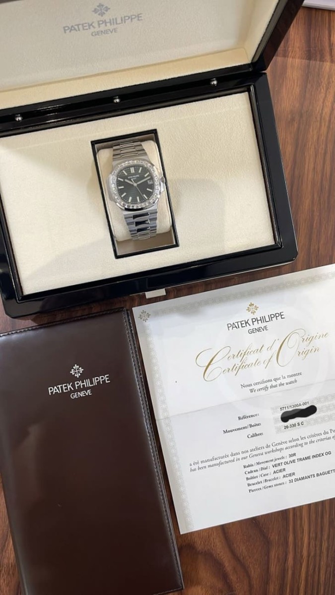 Nautilus 5711/1300A的錶圈鑲有32顆矩形切割鑽石,論溢價程度雖然沒有無鑲鑽款5711/1A-014那麼誇張,但兩款錶本來定價就有落差,鑲有鑽石的版本產量肯定也比較稀少,所以只要出現在拍賣會,絕對都能引起一波競標大戰。事實上同型號2024年6月也剛在蘇富比拍賣行舉辦的紐約Important Watches拍賣會售出過一只——賣家是鼎鼎大名的好萊塢動作巨星席維斯史特龍,那只綠面金鷹5711鑲鑽款最終成交價為492,000美金(約合台幣1572萬),同樣作為這次這款的參考標的,無底價競標的Nautilus 5711/1300A只要得標金額小於這個數字都會令得標者直呼賺到。Wilsons Auctions表示這只錶同樣也會附上原廠盒單,所以手錶的狀態也都還滿完整的。
