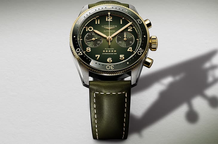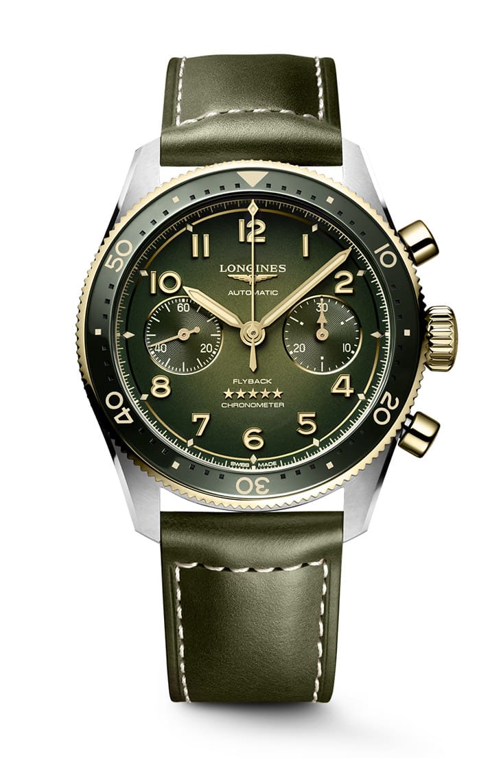 ▲Spirit Flyback先行者系列飛返計時碼錶以不鏽鋼加黃金的半金組合新登場,浪琴表並替其配上新色面盤。