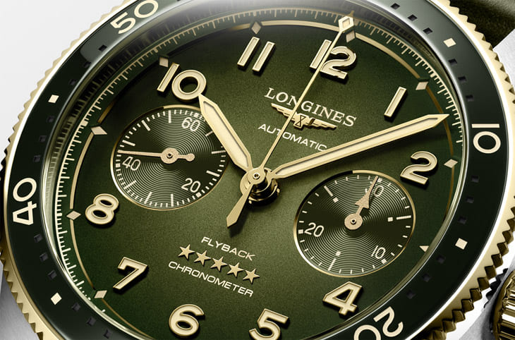 在手錶多層防反光藍寶石鏡面下,Spirit Flyback先行者系列飛返計時碼錶的綠色面盤呈現色澤由面盤中心往外逐漸變深的漸層效果,左右兩枚小錶盤雖然也是綠色,但其以同心圓紋修飾,反射出的光澤與綠色面盤本身形成自然的區隔。而在面盤上的細節如時標與指針部分,品牌都採金色設計並塗上古鐳色的Super-LumiNova®夜光塗層,由此散發出一股微微的懷舊氛圍。