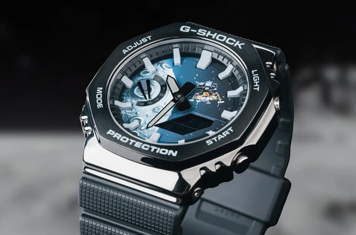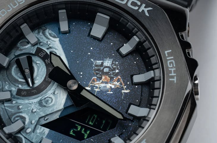 改裝後的IFL Watches × Fratello CasiOak “Moonlander”奠基於GM-2100BB-1A之外,他們決定採用月球為設計主題,向人類在1969年7月首度登月屆滿55週年致敬。雖然真要追本溯源,在阿波羅11號任務那個年代裡,G-SHOCK甚至還沒誕生,不過反而是在1980年代末期,當太空競賽時期早已經結束一段時間,一些比較新潮的太空人反而會戴著G-SHOCK搭乘太空梭、登上國際太空站,因此用G-SHOCK手錶來詮釋月球這種和太空有關的主題,廣義來說還是找得到關聯。