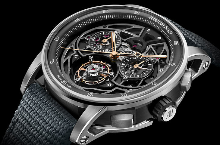 繼續往面盤中央可見以銠色調打造銀色飾面的機芯橋板,再往內與往下則都有黑色的發條盒橋板和主機板,如此一來從面盤外圍往內遂形成了由淺灰過渡到黑色的漸層色調。愛彼為了提升手錶視讀的清晰度,因此精心選擇拋光玫瑰金製作大、小指針,從時、分、計時大秒針,到兩枚小錶盤的計時指針通通都是相同材質,甚至陀飛輪框架內的擺輪顏色也和指針一樣,暖色調的金屬顏色在灰黑鏤空面盤上顯得一目瞭然。