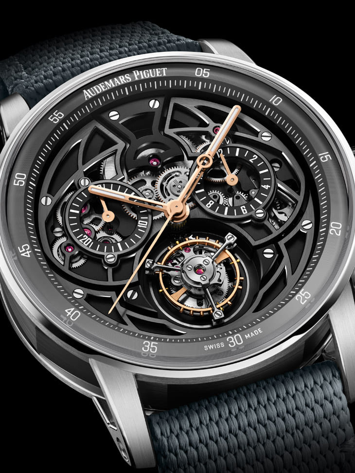 AUDEMARS PIGUET愛彼CODE 11.59系列旗下功能相對複雜的自動上鍊飛行陀飛輪計時碼錶相隔2年後近期推出最新改款,手錶繼上一回的玫瑰金搭配黑色陶瓷組合後,2024年則是換成白金材質與黑色陶瓷搭配,加上鏤空面盤的顏色也有相應變化,賦予手錶同中求異的微妙新意。
