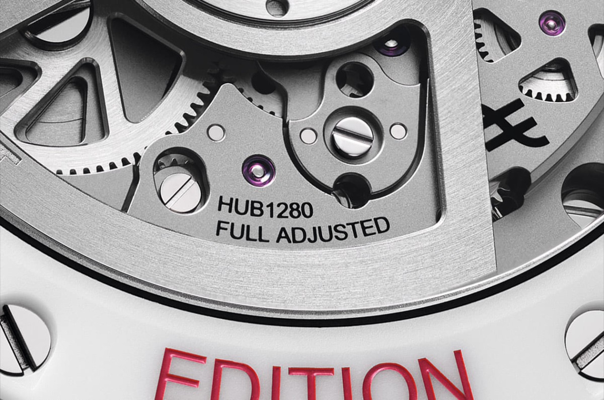 機芯自動盤中央的螺絲可以細部調整陶瓷滾珠施加於計時輪上的摩擦力,找到絕佳平衡以改善走時與計時過程中造成手錶失準的力矩問題;另外擒縱系統內部除了有矽材質零件,宇舶打造的專利微調系統更是一絕,透過調整擺輪橋板上含有宇舶Logo與皇冠造型般的鋸齒螺絲組件,游絲收放的長短便能改變,進而加快或減緩擺輪作動速度,讓機芯能夠詳實掌握到正確的走時速率,由機芯機板鐫刻的"FULL ADJUSTED"字樣,可知手錶在出廠前都經過品牌超過五方位的全方位精密調校(讓面盤與錶冠分別朝向不同方位以確認手錶的走時精準度不因方位影響而有嚴重差異)。