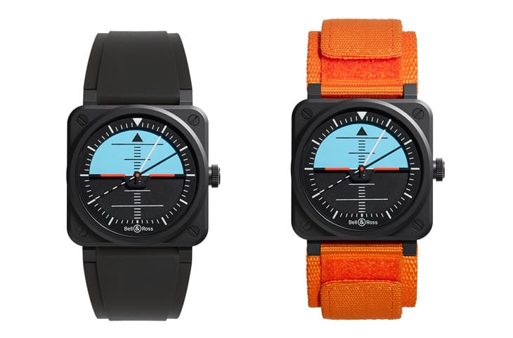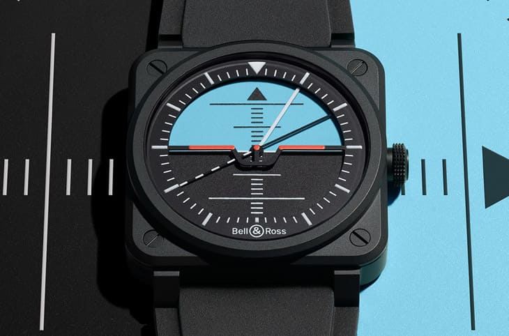 一般人也許一眼看不懂全新BR-03 Horizon的面盤圖案,可是對於飛行專業人員,乍看這只錶便會想到人工地平儀這個飛機儀表上不可或缺的儀器,通常這種儀表分成上下兩半,上半部為藍色、下半部則是黑色——前者代表天空、後者便象徵大地,在兩個半圓形色塊間會有一條紅線,這則是用以比擬飛機兩側的機翼。工地平儀外圍有刻度用來顯示飛機的傾角,而儀表中間也還有密密麻麻的垂直刻度,那是要表達飛機的俯仰角。