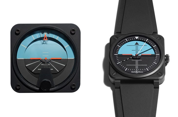 ▲BELL & ROSS以飛機儀表的人工地平儀(左)為靈感,打造出最新的飛行儀表時計系列作品BR-03 Horizon。