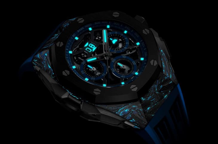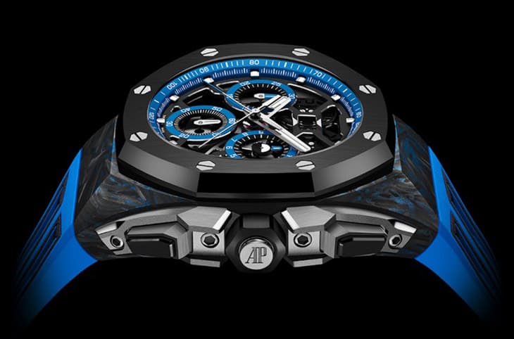 愛彼首次採用創新的彩色鍛造碳材質,有別於過往的鍛造碳材質,新材質乃是以最先進的色度鍛造技術(Chroma Forged Technology,CFT)打造出整體為深黑色中帶有其他顏色的創新材質。愛彼研發總監Lucas Raggi表示,CFT鍛造碳經過5年時間才開發完成,特色在於可以替傳統的鍛造碳「上色」,同時也保留了這種材質原本優異的特性;值得一提的是,品牌在融入色彩於鍛造碳之際,還一併優化了材質的耐濕、耐熱和抗震效果,提供手錶外部更理想的保護性。