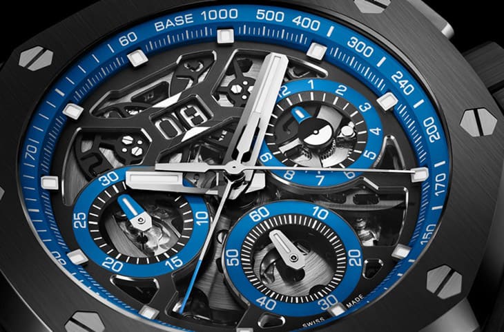 開面設計的面盤與前作一致,不過不同於前作呈現黑、灰雙色為主的低調設計,新款皇家橡樹概念雙追針GMT大日期計時碼錶將面盤外圍的測速計刻度環、小錶盤刻度環都改成藍色,與鏤空的黑色橋板以及灰色調的機芯零件搭配再度強化手錶的彩色風格,其中包括一枚追針指針,計時分針與兩地時間指針等都塗上藍色(小秒針則還是金屬原本的銀色調),圍繞著藍色的主體感因此更為強烈。