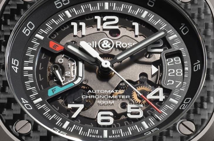 手錶面盤呈現系列招牌的方中帶圓造型,BELL & ROSS將賽車儀表板風格移植進手錶面盤,例如面盤外圍的分鐘刻度黑白相間很像賽車終點線揮舞的方格旗,另外秒針針尖特別塗上紅色、9點方向動力儲存顯示的造型都與賽車儀表有著互相呼應的既視感。細看動力儲存顯示,它的輪廓彷彿像是六邊形錶殼的半部,而動儲顯示刻度看著看著令人想起了油表,品牌以綠色的F字樣區塊代表動力滿格,而紅色的E字樣區塊代表手錶動力耗盡,小小巧思帶來顯著的賽車運動熱血氛圍。