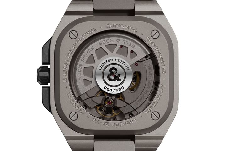 鈦金屬錶背中央挖有和面盤一樣的圓形,蓋上透明底蓋後,手錶搭載BR-CAL.323機芯的背面就此水落石出,透明底蓋與面盤一樣都帶有煙燻色,其自動盤經過鏤空處理後,讓人想起半顆賽車輪胎的輪圈,同時機芯底板的打磨、擒縱系統的運作動態也都能同步盡收眼底。BR-CAL.323機芯動力儲存達72小時,走時精準度通過瑞士天文台認證,確保其擁有值得信賴的品質。