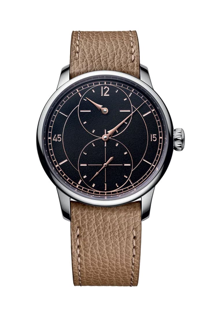 Le Régulateur Gravé Noir以不鏽鋼製成,表面經過拋光處理,搭配卡其色粒面小牛皮錶帶,讓手錶的黑色面盤顯得更有特色。面盤格局乃是受到1930年代錶壇經典的分區式面盤啟發,特徵在於利用雕刻、不同的修飾處理等,將面盤分成一個又一個區塊,這使得時間單位之間看起來一目瞭然。通常分區式面盤會有幾個共通點,例如蘊含同心圓設計與軌道式刻度,同時判讀時間也會格外清晰明快,以上的設計元素都與1930年代重新風行的新古典風格有關。