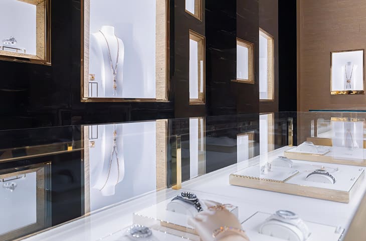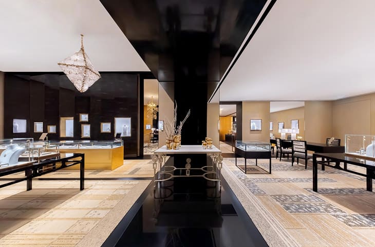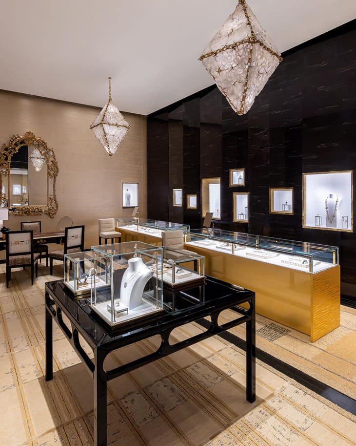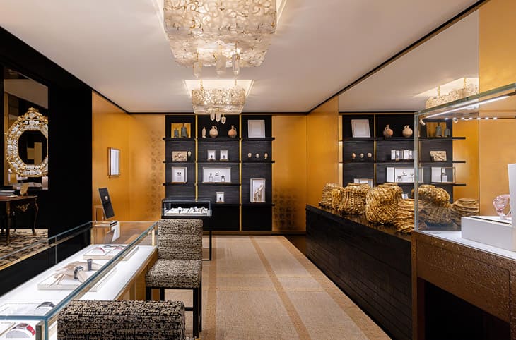 由於本身定位的關係,因此這家旗艦店事實上結合了珠寶工作坊、創意工作室、文化資產部門及腕錶珠寶專賣店等多重身份,例如展示間左側為珠寶沙龍,當代藝術家Delos & Ubiedo打造鍍金青銅結合石材的訂製邊桌座落於此,上頭擺放結合水晶、茶色玻璃,並飾以金箔製成的圓柱形花瓶,此外空間中還可見鑽石造型水晶吊燈映照著金色布幕牆、攝政時期鍍金鏡子和書桌,這些都與巴黎康朋街寓所有彼此呼應的意義。